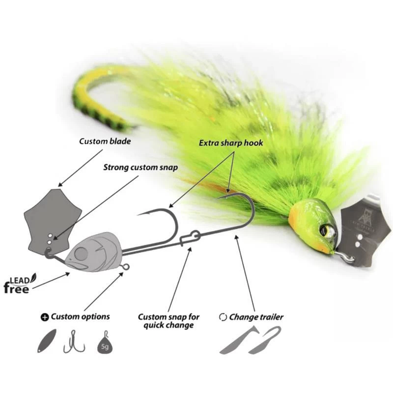 La conception du CHACHA BAIT lui confère une grande résistance grâce à son wire traversant et ses hameçons BIM spécialement conçus à cet effet. La forme de palette permet d’avoir une action constante sans pour autant opposer beaucoup de résistance, « de quoi vous per- mettre de prospecter sans que ça tire trop dans la canne ! ». L’oeillet ventral vous permettra d’y ajouter soit une palette pour plus de brillance, un poids supplémentaire pour pêcher plus profond ou un hameçon triple si nécessaire. La queue de lapin peut facilement être rem- placée grâce à son agrafe pour vous permettre d’y ajouter n’importe quel type de leurre souple en queue.